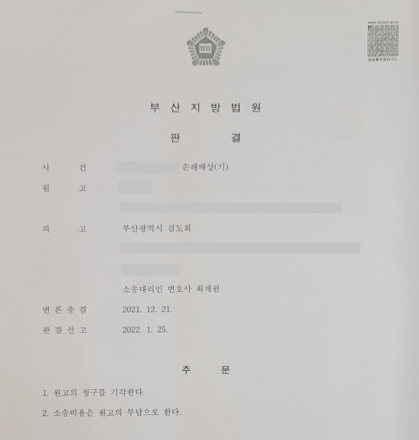 [민사] [최재원 변호사] 손해배상 청구 소송 전부승소(부산지방법원2021가소XXXX)