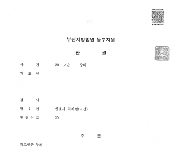 [형사] [최재원 변호사] 상해 무죄 판결 부산지방법원 동부지원 20XX고단XXX