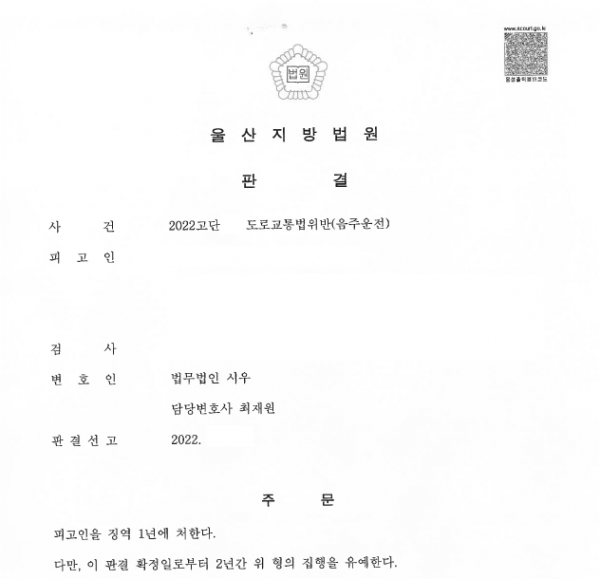 [형사] [최재원 변호사] 도로교통법위반(음주운전) 집행유예 판결 울산지방법원 2022고단XX