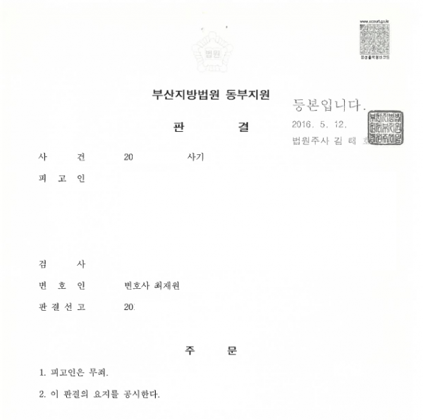 [형사] [최재원 변호사] 사기 무죄 판결 부산지방법원 동부지원 20XX고단XXXX
