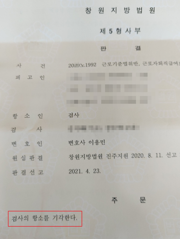 저희 법률사무소 이용민 변호사님께서 창원지방법원 20□□노1992 근로기준법 등 위반 사건에서 기업 대표이사를 변호하였고 항소심에서 검사 항소기각 판결을 선고 받았습니다(이용민 변호사가 1심에서 변호하여 무죄판결을 선고 받은 사건입니다).