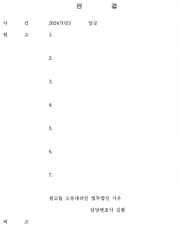 저희 법인의 심환 변호사님께서는 부산지방법원 2024가단31XXXX 임금 사건에서 원고(의뢰인)들을 대리하여 전부승소 판결을 이끌어내었습니다. 해당 사건은 피고측 회사의 부당한 제도에 따라 원고들이 임금 및 퇴직금을 적게 지급 받게 되어, 원고들이 피고를 대상으로 임금을 청구한 사건입니다. 심환 변호사님은 임금 사건의 하급심 판례들을 검토하고, 피고가 도입한 제도가 불합리하다는 사실을 구체적으로 입증해내었습니다. 이에 부산지방법원은 원고들의 청구를 전부 인용하는 것으로 승소판결을 내렸습니다. 앞으로도 저희 법무법인 시우의 구성원들은 의뢰인을 위해 최고의 성과를 이끌어 내도록 노력하겠습니다. 감사합니다.