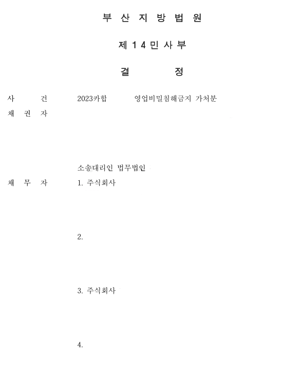 [민사] [최재원 변호사, 김지혜 변호사] 영업비밀침해금지 가처분 전부승소 판결 부산지방법원 2023카합XXXXX
