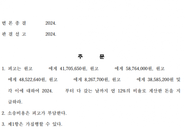 [민사] 심환 변호사 서울중앙지방법원 2024가단XXXXXXX 정산금 반환 청구 소송 승소사례