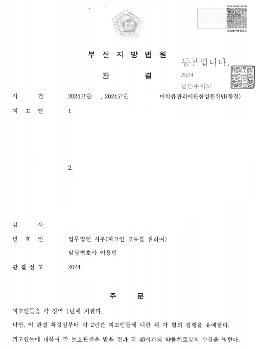 저희 법인의 이용민 변호사님께서는 최근 부산지방법원 마약류관리에관한법률위반 사건에서, 피고인들(의뢰인)에 대한 집행유예 판결을 이끌어 내셨습니다. 이용민 변호사님께서는 최선의 전략을 세우고, 양형에 참작할 자료를 치밀하게 준비하여 제출하였기에, 의뢰인들이 징역 1년, 집행유예 2년 선고를 받게 될 수 있었습니다. 앞으로도 저희 법무법인 시우의 구성원들은 의뢰인을 위해 최고의 성과를 이끌어 내도록 노력하겠습니다. 감사합니다.