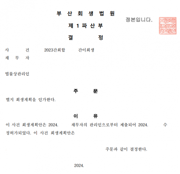[기타] [최재원 변호사,이용민 변호사, 심환 변호사]간이회생 인가결정 업무사례 부산회생법원 2023간회합XXXX