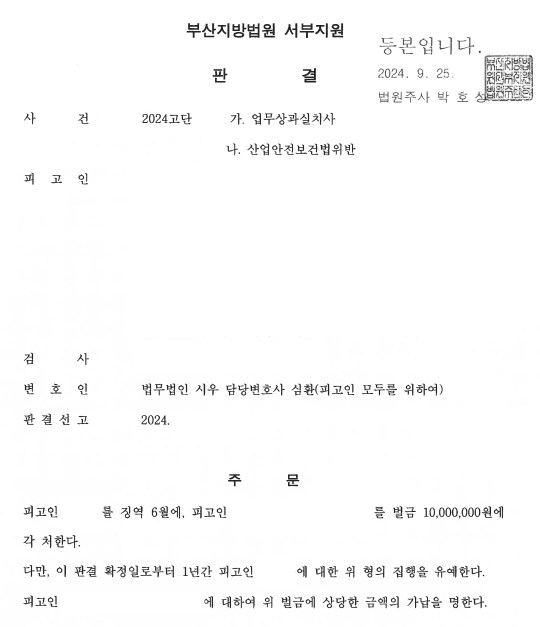 [형사] 부산지방법원 2024고단XXXX 업무상과실치사 등 집행유예 업무사례 심환 변호사