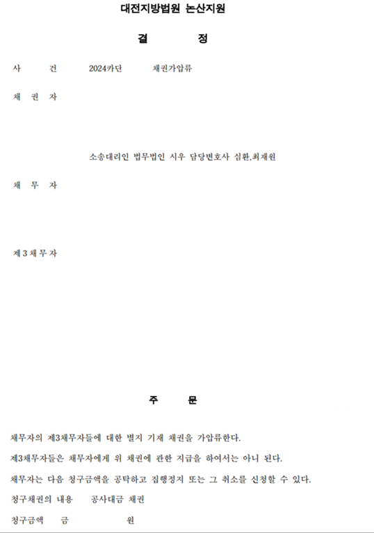 [민사] 심환 변호사 대전지방법원 논산지원 2024카단XXXXX 채권가압류 결정 업무사례