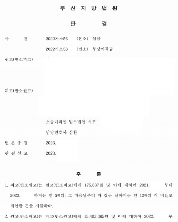 [민사] 심환 변호사 부산지방법원 임금 및 부당이득금 사건 업무사례