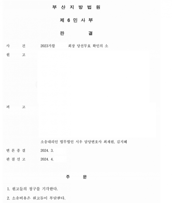 [민사] [최재원 변호사,김지혜 변호사] 회장 당선무효 확인의 소 전부승소 부산지방법원 2023가합XXXXX