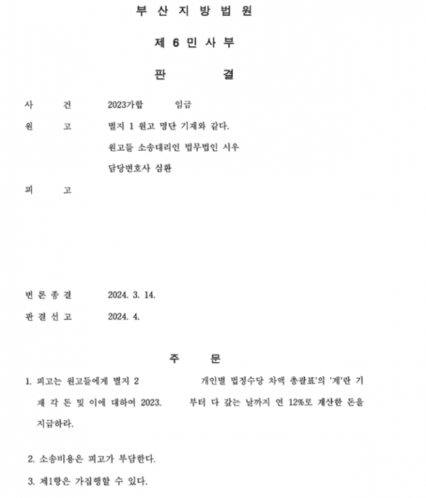 [민사] 심환 변호사 부산지방법원 2023가합XXXXX 임금 청구 전부 승소