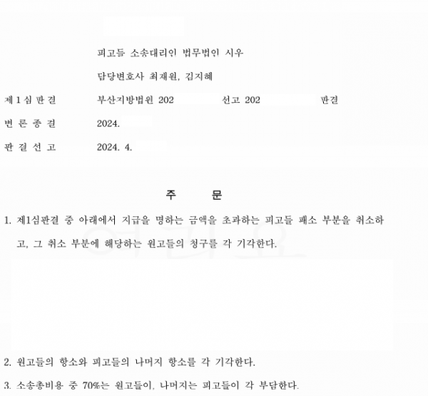 저희 법무법인 시우의 최재원 변호사님과 김지혜 변호사님께서는 부산지방법원 2022나XXXXX 손해배상(기) 사건에서 일부승소 판결을 이끌어내셨습니다.