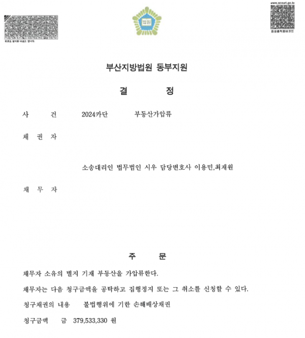 [민사] 부산지방법원 동부지원 2024카단XXXXXX 부동산 가압류 결정 업무사례 이용민 변호사
