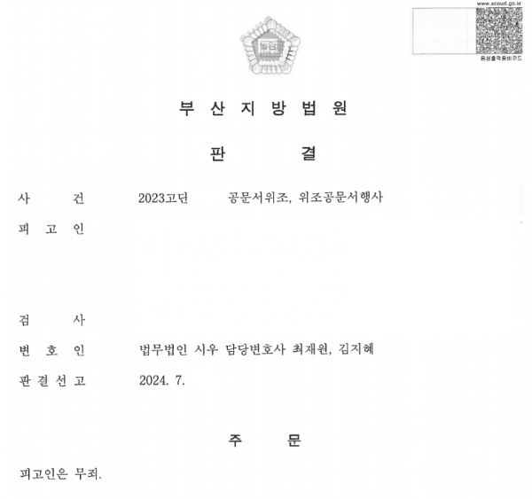 [형사] [최재원 변호사, 김지혜 변호사] 부산지방법원 공문서위조, 위조공문서행사 2023고단XXX 무죄 판결