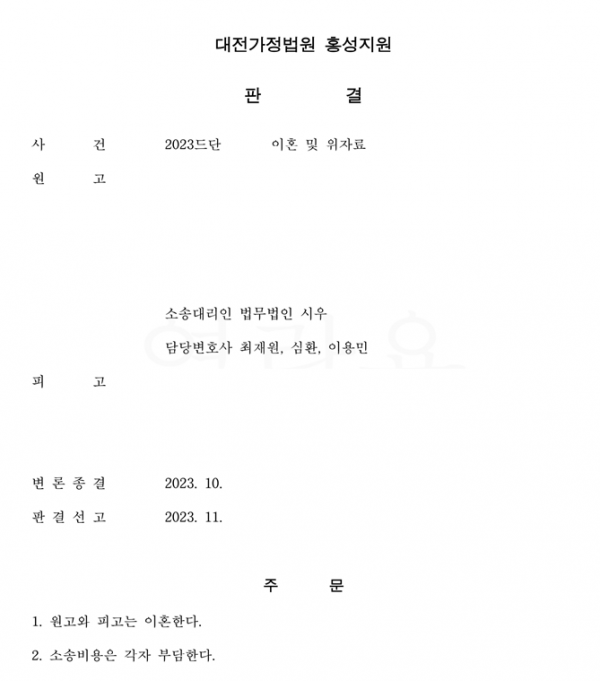 [가사] [최재원 변호사] 이혼 및 위자료 승소 대전가정법원 홍성지원 2023드단XXXXX 사례