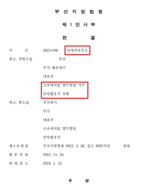 [민사] 부산지방법원2023나XXXXX 공공기관 임대차보증금반환청구 소송 전부 승소 판결 심환변호사