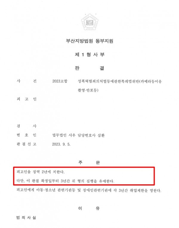 [형사] 부산지방법원2023고XXXXX 성폭력범죄의처벌등에관한특례법위반(카메라등이용촬영반포) 집행유예판결 선고 심환변호사
