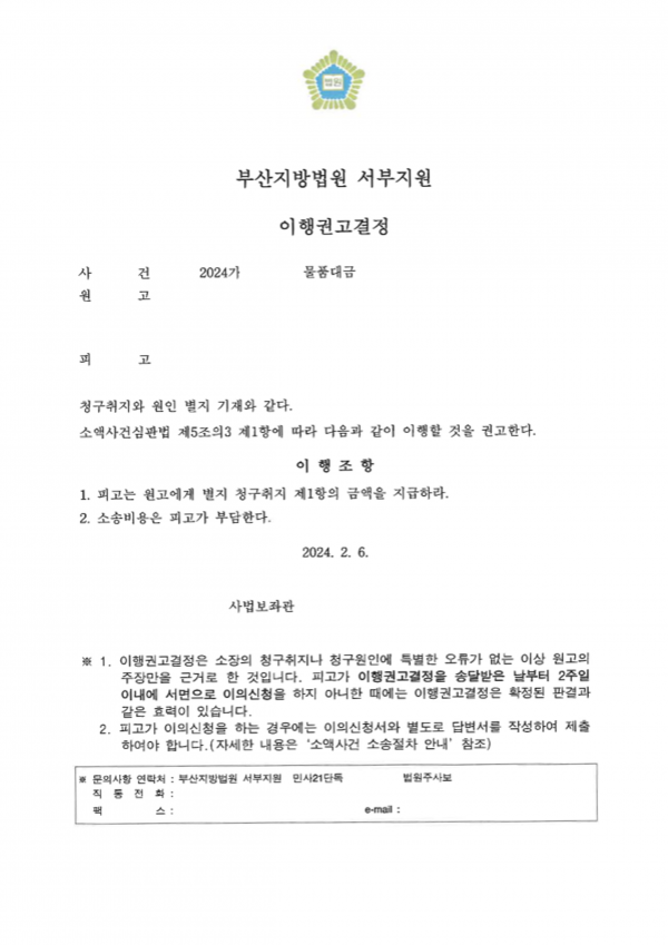 [민사] 부산지방법원 2024가소XXXXX 물품대금지급 업무사례 심환 변호사