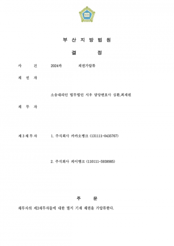[민사] 부산지방법원 2024카XXXXX 채권가압류 업무사례 심환 변호사