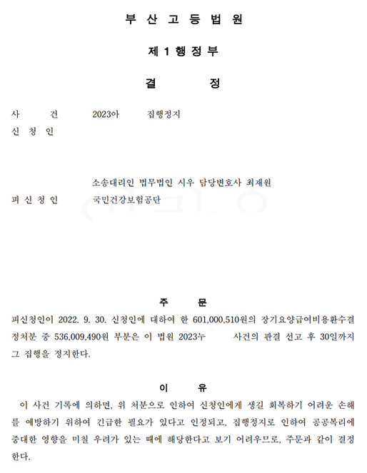 [행정] [최재원 변호사, 박민아 변호사] 집행정지 신청 인용 결정 부산고등법원 업무사례