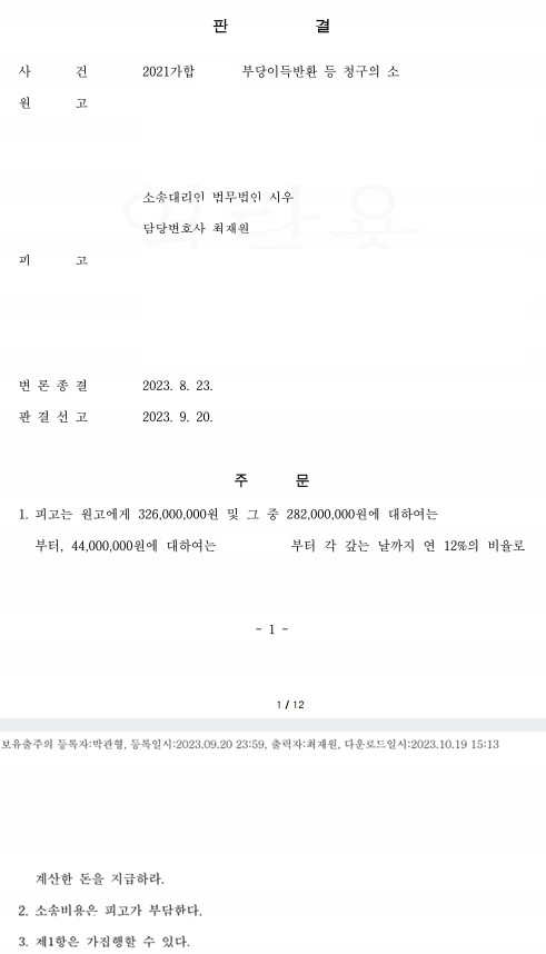 저희 법인의 최재원 변호사님께서는 최근 원고(의뢰인)를 대리하여 부당이득반환 등 청구 사건에서 승소 판결을 이끌어내셨습니다.