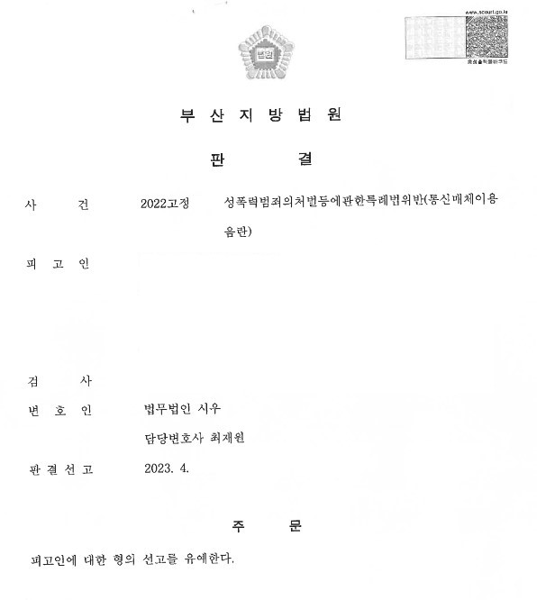 저희 법인의 최재원 변호사님께서는, 최근 부산지방법원 20XX고정XXX 성폭력범죄의 처벌 등에 관한 특례법 위반(통신매체이용음란)사건에서 피고인에 대한 형의 선고를 유예하는 판결을 이끌어 내었습니다.