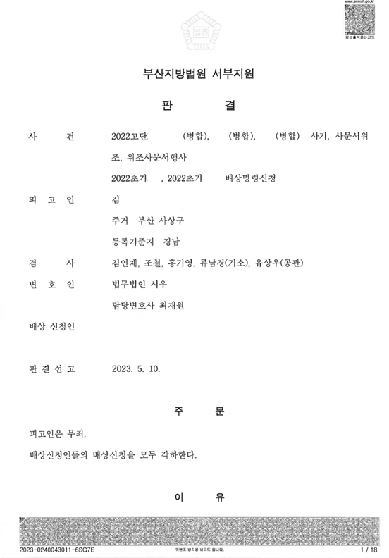 [형사] [최재원 변호사] 사기,사문서위조,위조사문서행사 무죄판결 부산지방법원 서부지원 20XX고단XXX
