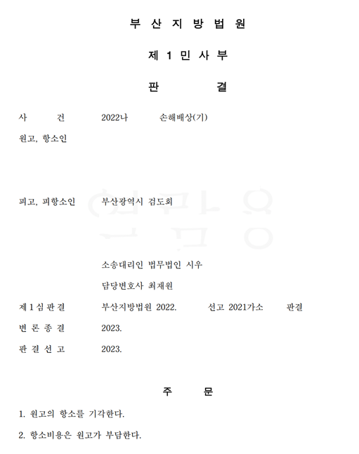 [민사] [최재원 변호사] 손해배상 청구 소송 전부 승소 판결 부산지방법원 20XX나XXXXX