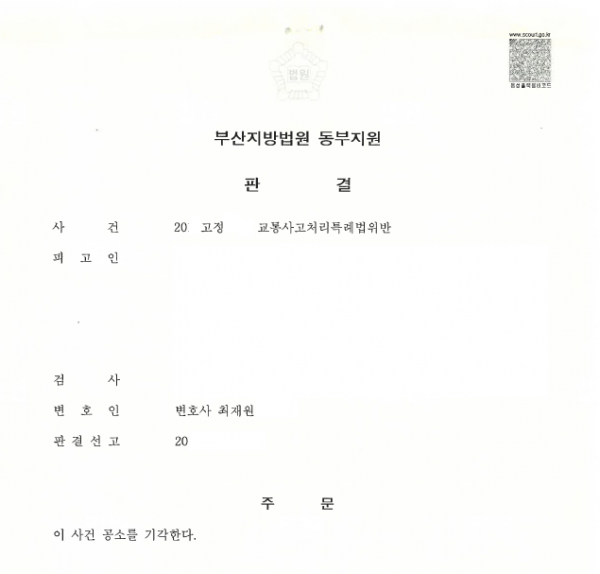 [형사] [최재원 변호사] 교통사고처리특례법위반 승소 사례 부산지방법원 동부지원 20XX고정XXX
