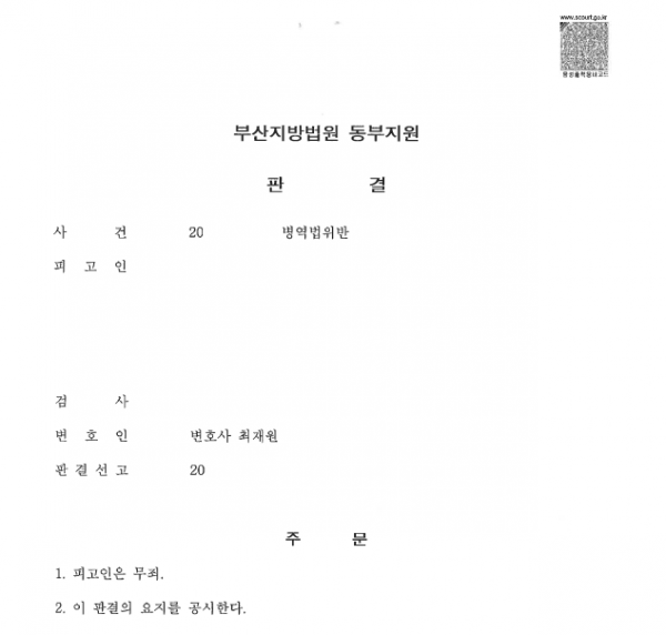 [형사] [최재원 변호사] 병역법위반 무죄 판결 부산지방법원 동부지원 20XX고단XXX
