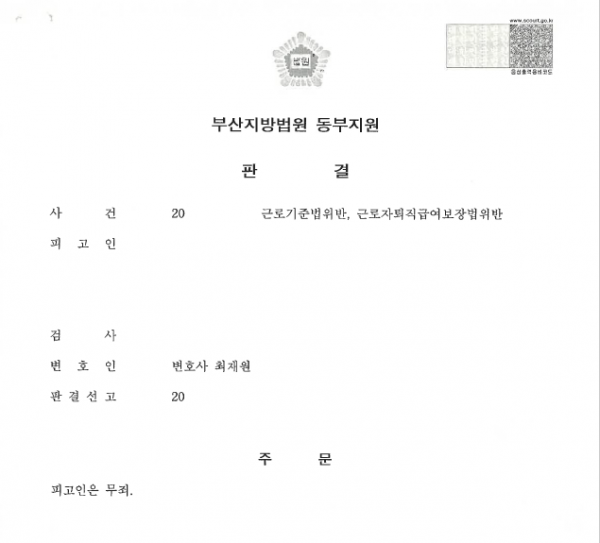 [형사] [최재원 변호사] 근로기준법위반 등 무죄 판결 부산지방법원 동부지원 20XX고정XXX