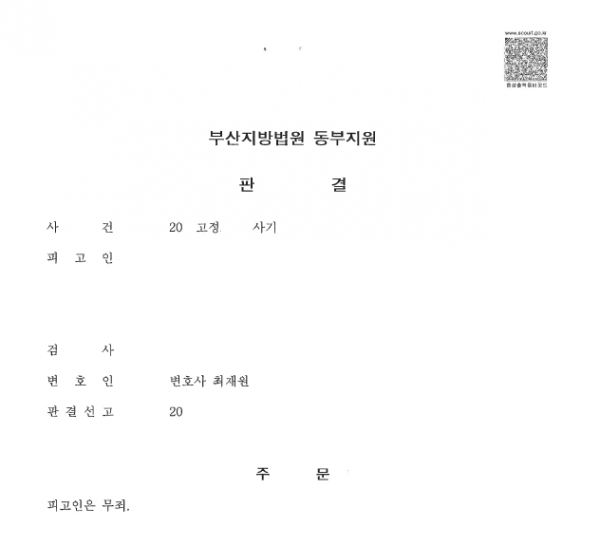 [형사] [최재원 변호사] 사기 무죄 판결 부산지방법원 동부지원 20XX고정XXX