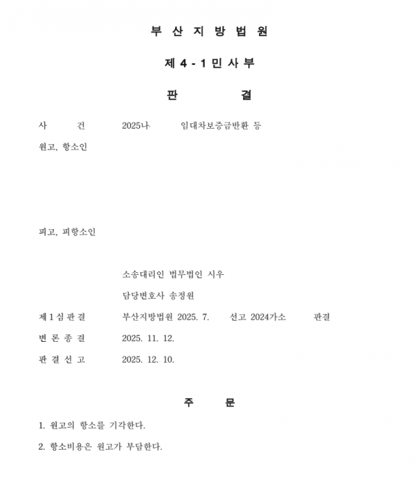 [민사] 임대차보증금반환 소송 항소기각 사례 [송정원 변호사]