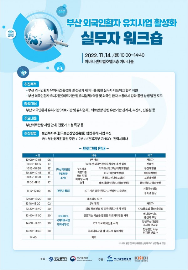 저희 법무법인시우의 최재원 변호사님께서는 2022.11.14.자 보건복지부가 주최하고 한국보건사업진흥원이 주관하는 부산 외국인환자 유치사업 활성화 실무자 워크숍에서 '국제의료사업법·제도적 유의사항'에 관해 강의를 하게 되었습니다. 강의의 주된 내용은 의료 해외진출 및 외국인환자 유치 지원에 관한 법률(의료해외진출법) 개정 내용 및 주의점 그리고 외국인 환자 유치 및 외국 자본 유치 관련 내용입니다. 최재원 변호사님은 현재 보건복지부 산하 보건산업진흥연구원의 전문위원(GHKOL)으로 활동 중인 바, 의료기관의 해외 진출 시 필요한 법률 자문을 제공해오고 있습니다. 앞으로도 의뢰인이 만족하는 성과를 도출해 내기 위해 노력을 다하겠습니다. 감사합니다.