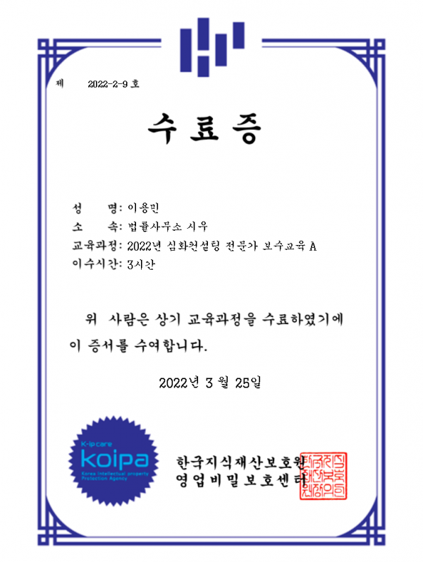 활동소식 이용민 변호사 한국지식재산보호원 영업비밀보호센터 영업비밀심화컨설팅 보수교육 수료