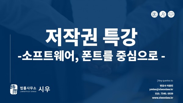 저희 법률사무소 이용민 변호사님께서 2021. 8. 2. 부산산업과학혁신원 임직원들을 대상으로 '소프트웨어, 폰트 저작권'에 관하여 강의하였습니다. 이용민 변호사님께서는 지금까지 다양한 저작권 자문 및 지적재산권 분쟁사건을 성공적으로 처리하였습니다. 이러한 경험과 능력을 인정받아 저작권과 관련된 수많은 강의를 하고 있습니다. 이용민 변호사님께서는 부산, 경남지역에 속한 여러 공공기관에서 저작권 관련 사업의 평가위원으로 활동하고 있으며, 다수의 기업 의뢰인에게 저작권 관련 자문, 소송 서비스를 제공하고 있습니다.