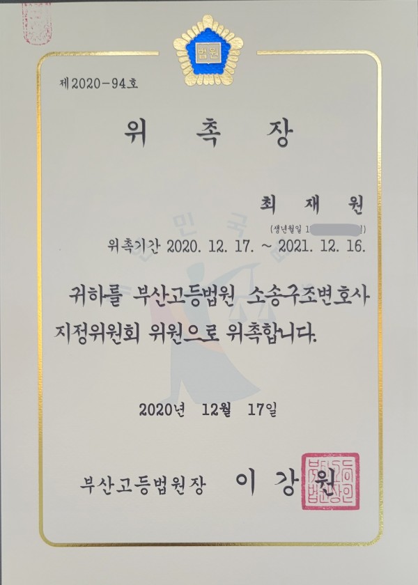 활동소식 최재원 변호사 부산고등법원 소송구조변호사 지정위원회 위원 위촉