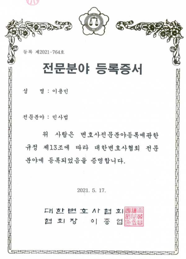 활동소식 이용민 변호사 민사법 전문분야 등록(대한변호사협회)