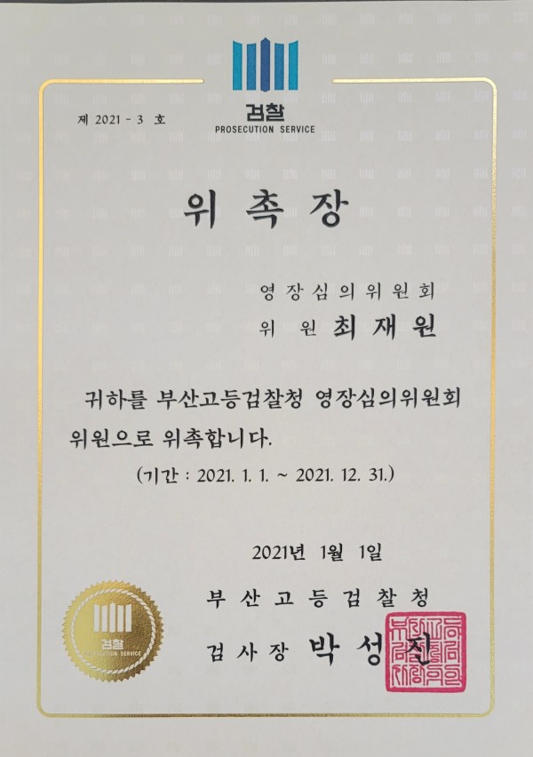 활동소식 최재원 변호사 부산고등검찰청 영장심의위원회 위원 위촉