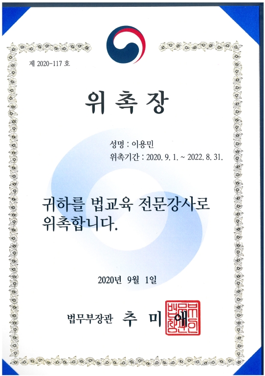 활동소식 이용민 변호사 법무부 법교육 전문강사 위촉