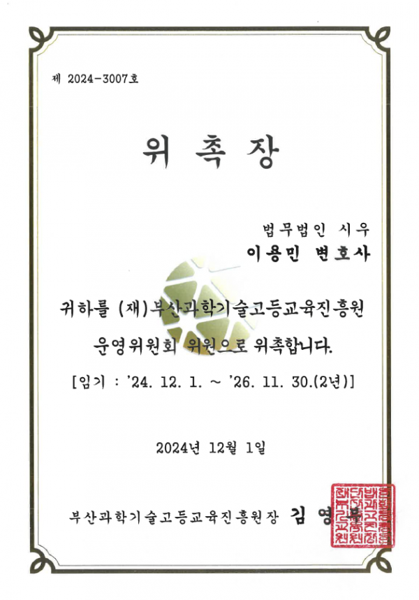 활동소식 이용민 변호사 (재)부산과학기술고등교육진흥원 운영위원회 위원 위촉 페이지 정보 최고관리자 작성일24-12-18 본문 저희 법무법인의 이용민 변호사님께서는 2024. 12. 1. (재)부산과학기술고등교육진흥원에서 운영위원회 위원으로 위촉되었습니다. 앞으로도 법무법인 시우의 구성원들은 다양한 분야에서 고객이 원하는 최고의 성과를 도출해 내기 위해 노력하겠습니다. 감사합니다. 목록 답변