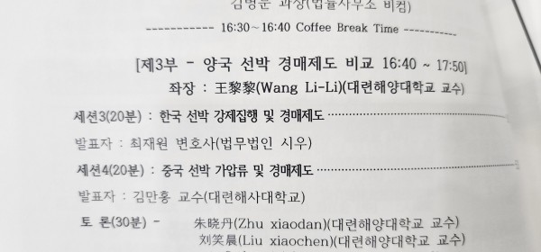 저희 법인의 최재원 변호사님께서는 2024. 10. 25.자 한·중간 부동산·선박 경매제도 비교법적 고찰을 주제로 하는 '2024년 한·중 국제학술대회'에 참석하셨습니다. 해당 학술대회는 저희 법무법인 시우가 후원하고, 한국부동산경매학회와 대련해양대학교 해양법률 및 인문대학이 공동으로 주최하는 학회입니다. 최재원 변호사님은 한국 선박 강제집행 및 경매제도에 관하여 의견을 개진하셨습니다. 앞으로도 저희 법인의 구성원들은 전문성을 바탕으로 의뢰인들께서 최선의 결과를 얻을 수 있도록 노력을 다하겠습니다. 감사합니다.