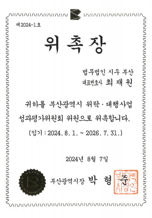 활동소식 최재원 변호사 부산광역시 위탁·대행사업 성과평가위원회 위원 위촉