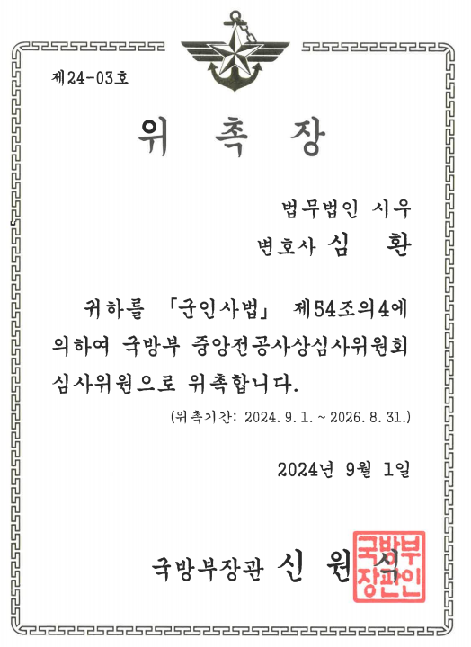 활동소식 심환 변호사 국방부 중앙전공사상심사위원회 심사위원 위촉