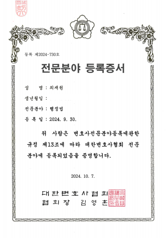 기타소식 최재원 변호사 행정법 전문변호사 등록