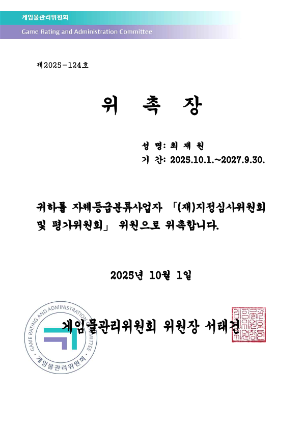 2025. 10. 1.  게임물관리위원회 자체등급분류사업자 (재)지정심사위원회 및 평가위원회 위원으로 위촉되셨습니다.