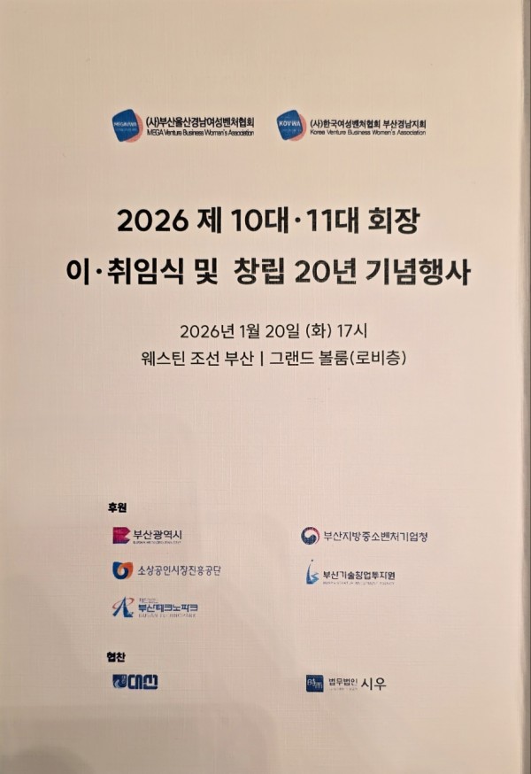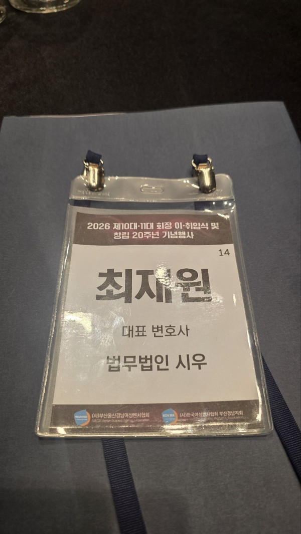 활동소식 최재원 변호사 (사)부산울산경남여성벤처협회 2026 제10대·11대 회장 이·취임식 및 창립 20주년 기념행사 참석